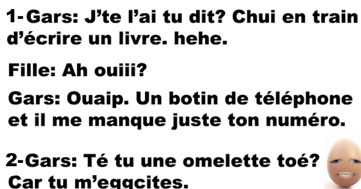 Pick up line francais pour gars. Top 101 Clever Pick Up Lines Posted on May 21, 19 May 21, 19 Les Listes is a participant in the Amazon Services LLC Associates Program, an affiliate advertising program designed to provide a means for us to earn fees by linking to Amazoncom and affiliated sites. Cheesy pick up lines, corny pick up lines, funny pick up lines and nerdy pick up lines We don't guarantee any results, but it's not uncommon to get a number or even a date You won't get any if you don't try!. Clever pickup lines might impress the guy or gal who gets your pulse racing, but humor could make you seem more confident if you’re trembling a little inside You’re going to have to use your intuition as to whether someone's in the mood for funny hospital jokes.