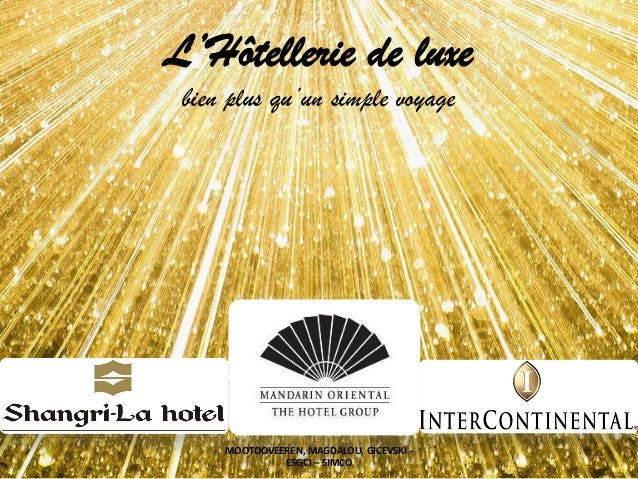 La clientèle des hôtels et restaurants de luxe étant majoritairement internationale (américaine, chinoise, russe, moyenorientale), il est devenu vital de recentrer les démarches de promotion sur les marchés de proximité, délaissés ces dernières années. Étude de cas de 2 pages en marketing & luxe L'hôtellerie de luxe présentation de Belmond Ce document a été mis à jour le 17/11/ Belmond est une entreprise hôtelière britannique de luxe présente dans 24 pays avec 46 propriétés ainsi que 3100 chambres. Le réseau exclusif des professionnels de l'hôtellerie de luxe et de la gastronomie étoilée PRÉSENTATION Vendôm répond par la positive aux établissements prestigieux et aux restaurants étoilés en leur proposant des candidats sélectionnés pour leur expérience.