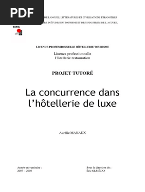 Hôtellerie de luxe et domotique Alors que la France est la première destination touristique mondiale, les hôtels de luxe doivent aujourd’hui faire face à de nombreux défis une concurrence internationale et locale accrue et une clientèle de plus en plus exigeante et en demande d’expériences uniques. Le marché de hôtellerie de Luxe à Paris CHOTELLERIE DE LUXE À PARIS L’HOTELLERIE Introduction j’ai choisi d’étudier hôtellerie car j’ai des notions de ce secteur, mon père ayant eût un hôtel quatre étoiles dans une ville de province, j’ai pu apprendre beaucoup de choses tant en gestion que sur « le terrain J’ai trouvé intéressant de faire mes recherches sur l’hôtellerie pour en a davantage. S'informer, communiquer, être mis en relation et recruter Le Journal des Palaces, quotidien de l'hôtellerie de luxe depuis 04, propose des actualités, des ressources et des offres d'emploi.