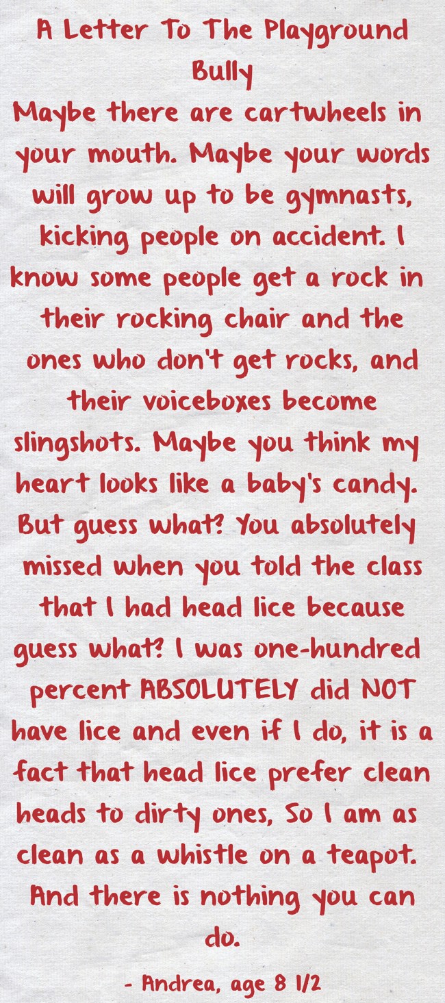 Andrea Gibson’s’ poem ‘Letter to the Playground Bully’ is an unforgettable poem about bullying She cleverly crafts a poem from the perspective of an 8 and a half year old girl who is trying to. Playground EquipmentPlay AreaAdvertise With Us. May 02, 18Nobody just walks into faith, unchallenged When I was nine years old, a bully named Ricky started picking on me This happened sometime back during the Jurassic period,.
