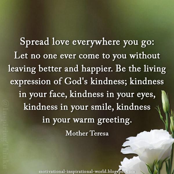 “Spread love everywhere you go Let no one ever come to you without leaving happier” Mother Teresa A woman I know has a terrible disposition She often wears a scowl on her face and her body language screams, “Get Away From Me!” People are afraid to talk to her or ask her a question in fear that she will respond sarcastically. Spread love everywhere you go Let no one ever come to you without leaving happier Related Videos 305 I've been searching for ways to heal myself, and I've found that kindness is the best way In God We Trust 52K views · September 29, 305 Kindness can become its own motive We are made kind by being kind. "Spread love everywhere you go Let no one ever come to you without leaving happier" Mother Teresa.