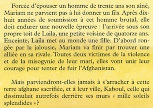 Mille soleils. Pages are clean and are not marred by notes or folds of any kind At ThriftBooks, our motto is Read More, Spend Less See details Mille soleils splendides (French Edition) by Khaled Hosseini. Villa Mille Soleils An advisor of proximity from the area will help you find a Seniors Residence according to your needs and will assist you during the visits. Mille Soleils splendides Khaled Hosseini Belfond, 07 RESUME De 1959 à 03, vous allez vivre le destin de deux femmes afghanes, Mariam et Laïla, deux femmes que tout oppose leur naissance, Mariam est une enfant illégitime, une harami, élevée par sa mère, Nana, Laïla est la fille de Hakim, un professeur d’université ;.