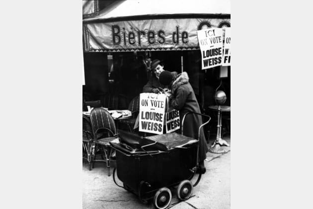 75e anniversaire du droit de vote des femmes PHOTOS Pause En 1935, l'écrivain et journaliste Louise Weiss installe un bureau de vote à Paris où femmes et hommes peuvent venir voter à l'occasion des élections municipales après avoir présenté leur candidature symbolique.