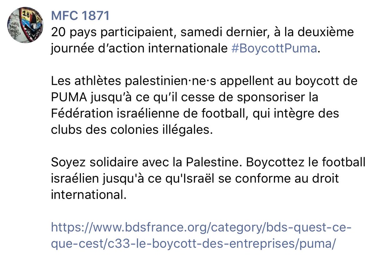 s France Le Menilmontant Fc 1871 Club De Football Parisien Antifasciste Et Populaire Soutient L Appel Palestinien Au Boycott De Puma Puma Sponsorise La Federation Israelienne De Football Qui Inclut Des