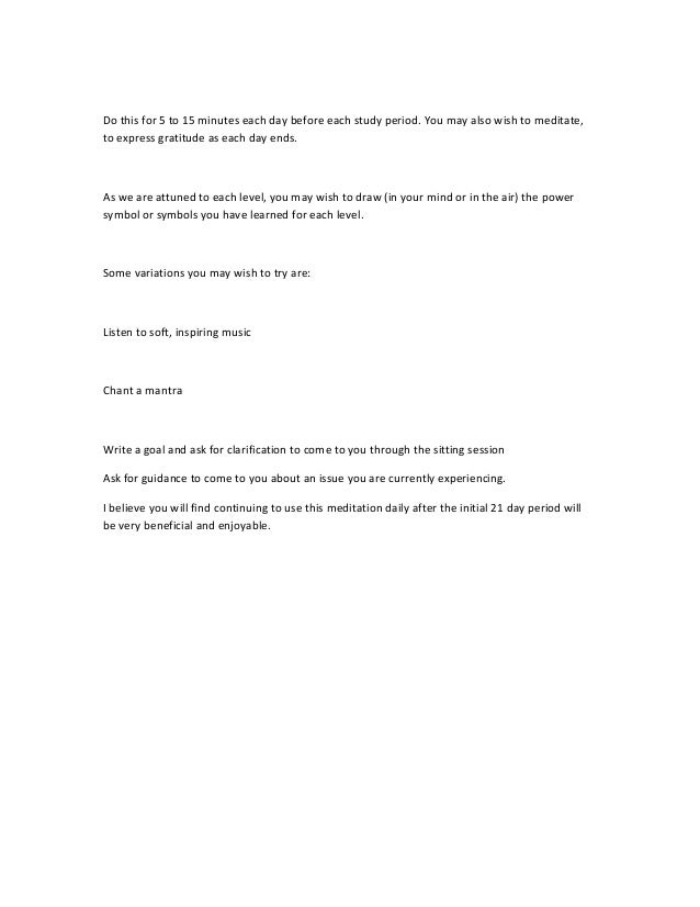 Today, work with integrity;. Gassho is a gesture of respect, with hands together palm to palm, fingers pointing up, with fingertips one fists distance from the tip of your nose. 5 Gassho meditation 6 The Five Admonitions 7 The two precepts of Reiki 8 Explanation of Attunements 9 Hand Positions 10 Self Reiki 11 Cho Ku Reiki What it is and how to use it 12 First degree attunement In order to receive your Reiki Level I certificate you must 1 Complete the course outlined above 2 Participate in 2.