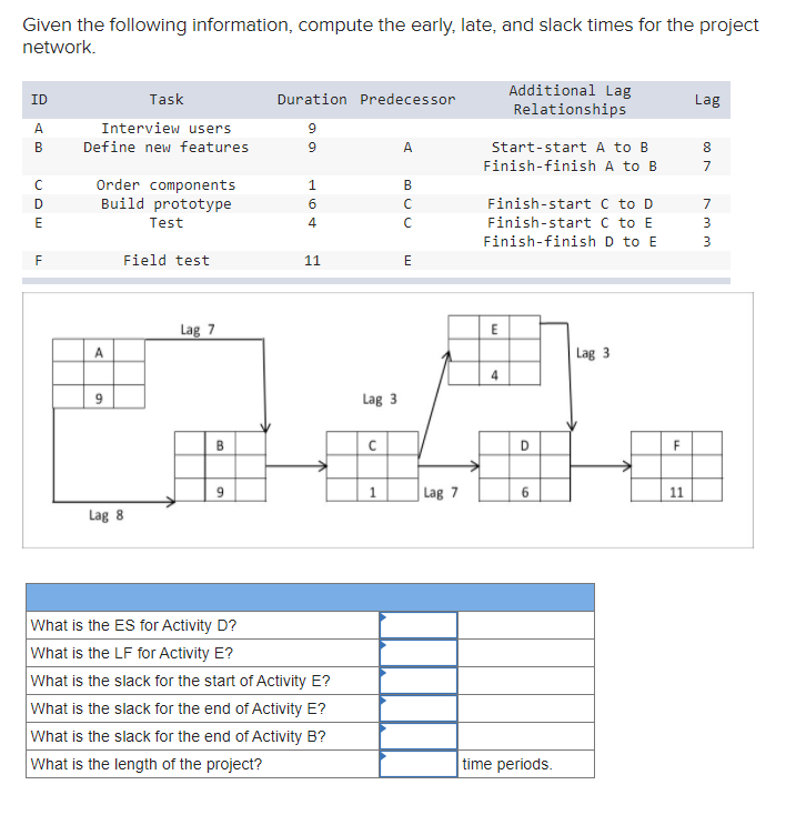 Solved Given The Network Plan That Follows Compute The Early Late And Slack Times What Is The Project Duration Course Hero
