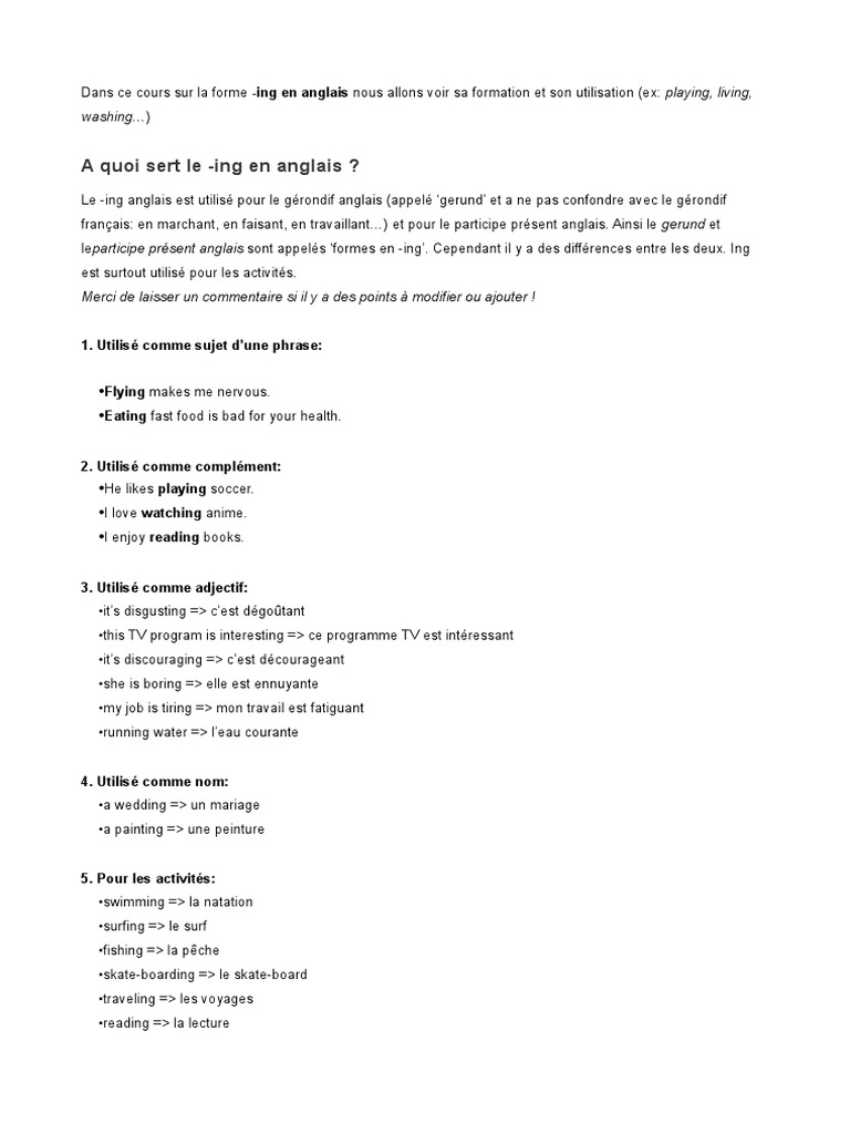Notez bien qu'en anglais américain on utilise parfois le prétérit au lieu du present perfect On emploie souvent le present perfect pour faire un bilan d'actions achevées ou inachevées Exemples modifier modifier le wikicode I've done it!. Formes composées participe participer Français Anglais en participe présent prép préposition met en relation un nom et un autre élément Ex "la voiture de ma mère", "une carte à jouer" (tout en) while present participle prep preposition Relates noun or pronoun to another element of sentencefor example, "a picture of John," "She walked from my house to yours". Participe présent PARTICIPE PRÉSENT Contrairement à l'adjectif le participe présent est invariable, il forme sa terminaison en ANT Il ne faut pas confondre l'adjectif et le participe présent, dans la plupart des cas leur terminaison est différente, mais parfois ils ont la même.
