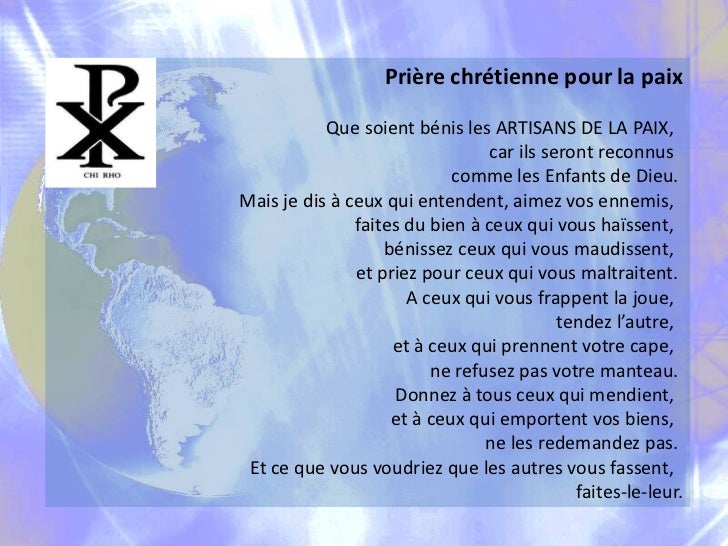 Si nous voulons la paix pour le monde, elle doit naître de nos cœur Voici une prière du saint pape tirée de ce même discours pour demander à Dieu de nous aider à construire un monde meilleur de. Dans leurs actions et se tournent vers le chemin de la paix et du bien, du respect pour la vie et la dignité de chaque être humain, quelle que soit sa religion, son origine, sa richesse ou sa pauvreté Ô Dieu, Pèe étenel, dans ta onté entends note pièe ui s’élève ves toi au milieu du fracas et du désespoir de ce monde. Vous pouvez constater avec moi que ces derniers temps, il y a pleins d'attentats et des guerres Venons récommander nos intentions au seigneur Jésus et à notre très chere maman Marie.