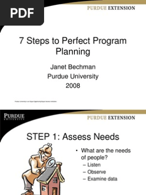 Principles, Steps of programme planning, evaluation and monitoring of programme planning 1 Dr Arpita Sharma Assistant Professor, GBPUA&T, Pantnagar Course Dimensions of Agricultural Extension Formative evaluation ensures that a program or program activity is feasible, appropriate, and acceptable before it is fully implemented. 7 Steps to Perfect Program Planning Janet Bechman Purdue University 08 Purdue University is an Equal Opportunity/Equal Access institution What does “program” mean to you?\爀屲Our definition sequence of educational experiences purposely selected to address locally \൩dentified need or issue. The Seven Steps of Action Planning Define the Problem(s) Collect and Analyze the Data;.
