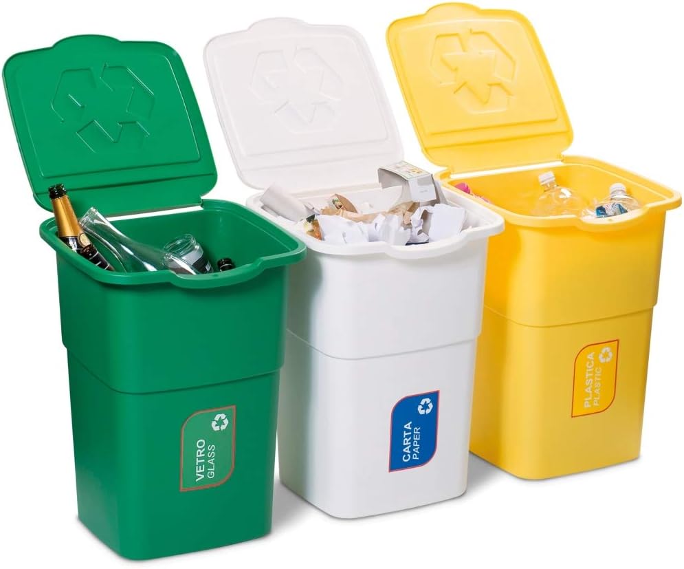 Lot De 3 Poubelles De 50 L Pour Tri Selectif En Blanc Jaune Vert Avec Autocollants Pour Le Verre Le Papier Et Le Plastique Amazon Fr Cuisine Maison
