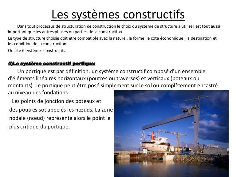 Dans la structure, chaque poutre de poteau 4 ou de traverse 5 est constituée d'un caisson à section transversale rectangulaire, dont le grand côté est parallèle au plan du portique, les petites faces des poutres étant de largeur constante et leurs grandes faces ayant l'allure trapézoïdale courante des poutres de portique Chaque poutre peut être formée de deux parties à section en U. A gantry crane is a crane built atop a gantry, which is a structure used to straddle an object or workspaceThey can range from enormous "full" gantry cranes, capable of lifting some of the heaviest loads in the world, to small shop cranes, used for tasks such as lifting automobile engines out of vehicles. Structure l Ne Ie 4 3 1 5 3 2 12 6 6 FIG 23 Œ Nombre d’efforts de liaison l, nombre d’·equations d’·equilibre Ne, degre· d’hyperstaticit·e externe Ie ceuxci sont accessibles au d·epart des seules ·equations d’·equilibre de la statique, la structure est dite statiquement d·etermin ·ee, ou encore, isostatique Si, parcontre,.