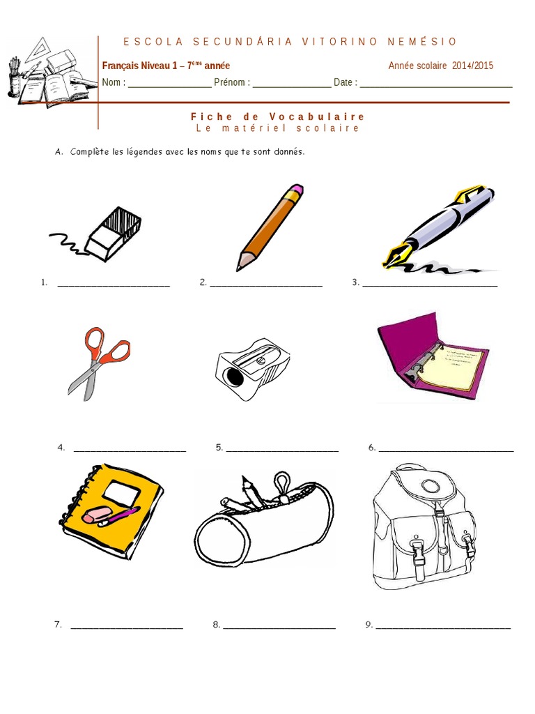 Ecole Materiel Scolaire Francais Fle Fiches Pedagogiques