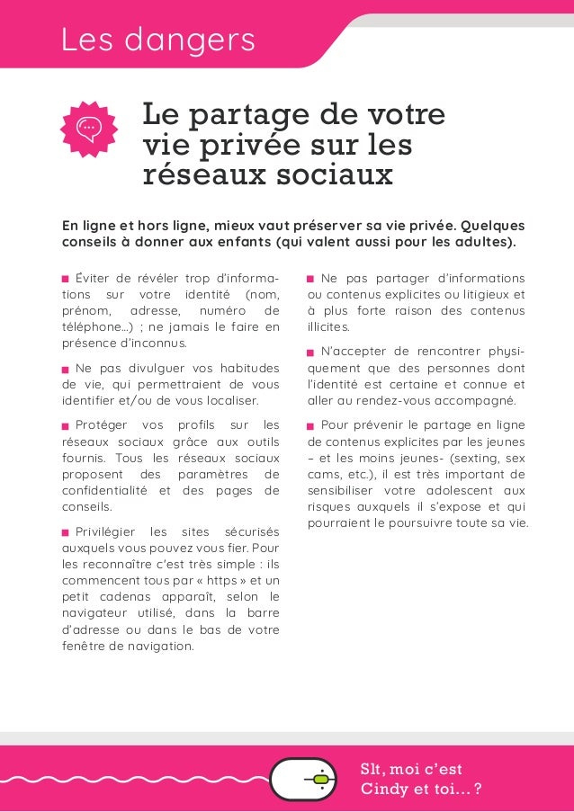 Les dangers d'Internet Aujourd’hui, Internet occupe une place importante dans notre vie quotidienne il nous donne accès à des outils précieux pour approfondir nos connaissances, nous informer et communiquer plus facilement Cependant, la toile est également un espace à risques qu'il faut savoir utiliser. Les dangers que représentent internet et les réseaux sociaux pour les enfants Chiffres éloquents selon une étude du CREDOC réalisée en 13, 100% des français de 12 à 17 ans sont internautes Plus précisément , 77% des jeunes de 11 à 17 ans déclarent aller au moins une fois par jour sur le web et 61 % sur Facebook (1) Même si. Se protéger dans la vie de tous les jours Fiche de préparation (séquence) pour les niveaux de CE2, CM1 et CM2 L'objectif de cette séquence est "Connaitre les règles de sécurité Connaitre les gestes de premiers secours Connaitre les règles élémentaires de sécurité routière Connaitre les risques liés à l'usage d'Internet".