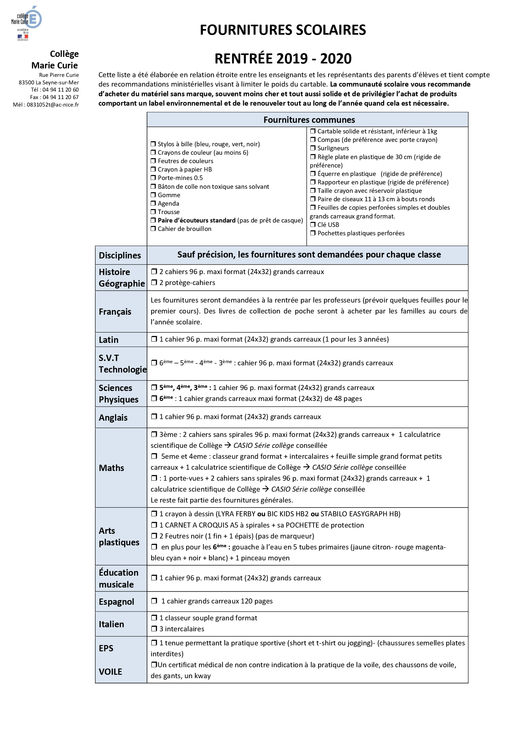 Liste Des Fournitures Scolaires Rs 19 College Marie Curiecollege Marie Curie