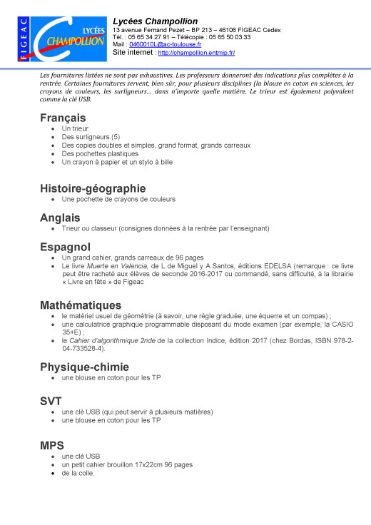 Liste Indicative Des Fournitures Scolaires 2gt Rentree 17 Actualites Agenda Lycee Des Metiers Champollion