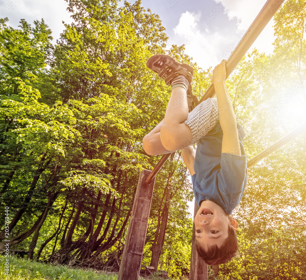 Happy Child Boy Hanging Upside Down On Bar Playground In Forest Outdoor Activities Wall Mural Bez Bretelky