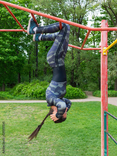 Girl Trains On The Bar Hanging Upside Down And Shakes The Press Buy This Stock Photo And Explore Similar Images At Adobe Stock Adobe Stock