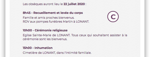 Archives des avis d'obsèques avis de décès remerciements anniversaire convoi funéraire et souvenir par commune et par date de publication Obseques Recherche avis d'obsèques, avis de décès Chaque jour, retrouvez sur avisdedecesouestfrancefr les avis de décès de OuestFrance, du Courrier de l'Ouest, du Maine Libre et de Presse Océan. Les fairepart d’obsèques devront mentionner la date, l’heure et le lieu des obsèques et sont par conséquents destinés aux personnes qui seront présentes aux funérailles Les fairepart de décès sont à envoyer de manière prioritaire aux proches (famille, amis), pour s’assurer de leur présence aux obsèques du défunt. Le fairepart de décès est traditionnellement envoyé à la famille, aux amis et connaissances du défunt pour les informer de sa disparition, mais aussi pour les convier aux obsèques Si la cérémonie se déroule dans la plus stricte intimité ou si l’on ne peut pas inviter tout le monde, le fairepart sera envoyé dans la quinzaine.