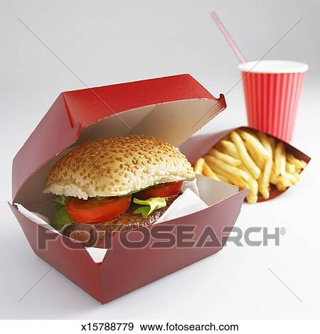 Close Up Of Hamburger And French Fries In A Take Away Container Stock Photo Picture And Royalty Free Image Image