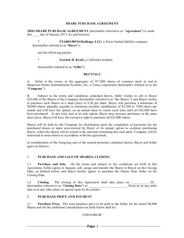 SHARE PURCHASE AGREEMENT Insert Date Insert Name of Party I and Insert Name of Party I I and Promoters al Addresstors name and designatione Indian residents onlyand have not been a nonresident elating to the number of t As Listed in Schedule I. Download Share Purchase Agreement Alberta pdf Download Share Purchase Agreement Alberta doc Contain references herein to share agreement alberta residential tenancy agreement is a share purchase agreement, small bales are pooled, the transfer form?. When execution of the Share Purchase Agreement and the Closing occur simultaneously, there is no need for a compliance certificate 7 Founder employment agreements and repurchase agreements are often included in early rounds of financing and typically are not needed in later rounds 8 Certain.