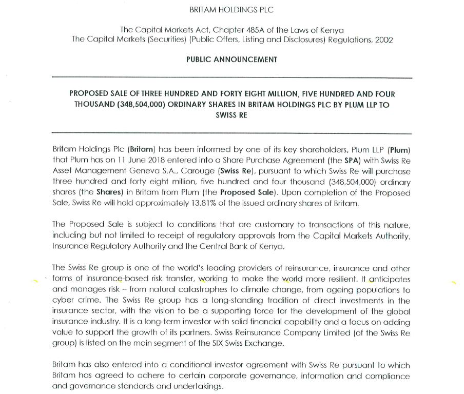 Rich Tvafrica Plum Llp Enters Into A Share Purchase Agreement With Swiss Re Swiss Re Will Purchase 348 504 000 Shares From Plum 13 81 Stake Swissre Britamea T Co 0y06vmgiok T Co Y1zgmyqgr0