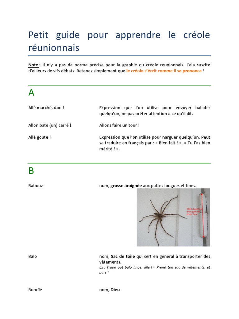 Dictionnaire Créole Réunionnais/Français (Dictionnaire), Daniel Baggioni, Éditions l'Harmattan;. Dictionnaire Kréol rénioné Français (Dictionnaire), Alain Armand, Océans Éditions (1987) Dofé sou la pay kann (Roman), Graziella Leveneur, Éditions Grand Océan;. A La Réunion comme partout en France, le français est la langue officielle Les Réunionnais parlent également le créole Cette langue s’est construite au fil des siècles, avec l’apport des nouveaux arrivants venus s’installer dans la petite île de l’océan indien Le créole est donc un mélange de Français – et particulièrement des dialectes du.