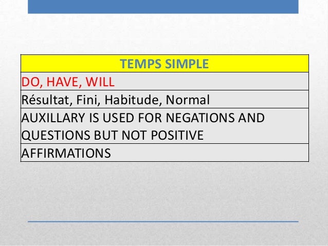 Fiches de cours de Droit Civil, commercial, administratif, bancaire, emploi Apprendre en ligne gratuitement Mooc. Ainsi, l'usage des modes et des temps du français ne recouvre pas nécessairement celui des modes et temps anglais. Simple future has two different forms in English:.