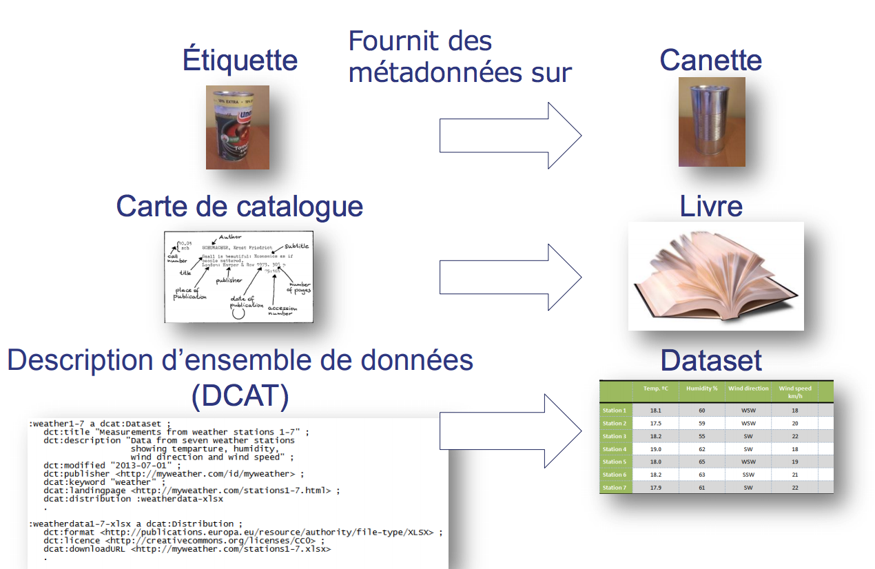 Un exemple type est d'associer à une donnée la date à laquelle elle a été produite ou enregistrée, ou à une photo les coordonnées GPS du lieu où elle a été prise Les métadonnées sont à la base des techniques du Web sémantique Elles sont définies dans le cadre du modèle Resource Description Framework (RDF). Exemple de métadonnées dans la vie réelle Pour comprendre ce qu’est une métadonnée, on peut prendre l’exemple d’une bibliothèque Bien souvent, les ouvrages y sont classés selon une méthode appelée classification de Dewey La classe du livre n’est pas contenue dans le livre luimême. Métadonnées doivent être conservés après que les données ont été supprimées, par exemple, d'informer sur les données qui ont été déclassés ou retirés Schéma de métadonnées « Un système de labellisation, marquage et codage utilisé pour l’enregistrement d’information de catalogue ou pour structurer des notices descriptives.