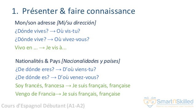 1) L’identité – La identitad Commençons par le plus important, son patronyme qui fait de chaque personne une personne unique Nous héritons d’un prénom et d’un nom lors de notre naissance, cependant de part notre vécu, notre nom peut être partag. Diteslui d’où vous venez Une fois que vous avez progressé audelà de l’introduction de base, continuez la conversation en leur parlant un peu de vous Surtout si vous voyagez, parler de votre pays d’origine est une bonne étape suivante Utilisez l’expression « soja de » pour présenter l’endroit d’où vous venez Si vous vivez actuellement ailleurs que. Dire son âge ( séances sur les nombres pour pouvoir dire son âge) Télécharger “Séquence « Se présenter »” Téléchargé fois – 142 Ko.