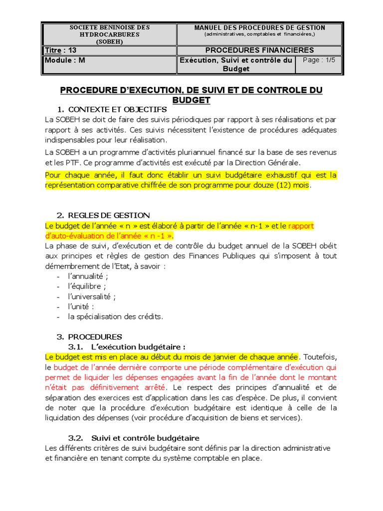 Procedure D Execution De Suivi Et De Controle Du Budget Budget Comptabilite