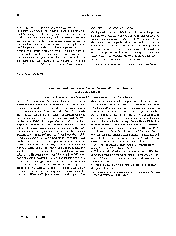 Pdf Tuberculose Multifocale Associee A Une Vascularite Cerebrale A Propos D Un Cas S Othmani Academia Edu