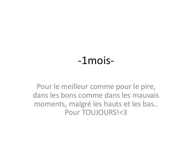 Je n’ai pas besoin de toi, j’ai envie d’être avec toi Je n’ai pas d’espaces vides à remplir, j’ai des espaces à partager Je ne m’attends pas à ce que tu me rendes heureuse, je veux sourire de ta joie et te faire sourire de la mienne Je ne suis pas à toi et tu n’es pas à moi. Nos coeurs , nos âmes et nos pensées sont liés à jamais Je t’aime !. Ma chérie, avec toi l’amour c’est pour toujours !.