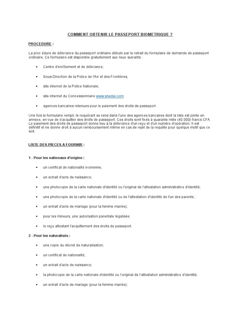 La photocopie des trois premières pages du passeport en cas de renouvellement ou une déclaration de perte (vol ou perte) Document de naissance;. éventuellement un extrait d'acte de naissance. Si vous avez acquis la nationalité ivoirienne après une demande, voici ce qu’il vous faut fournir afin d’obtenir votre passeport ivoirien – Une photocopie de votre décret de naturalisation – Une photocopie de votre CNI ivoirienne ou l’original de l’attestation d’identité – Une autorisation parentale si vous êtes encore mineur.