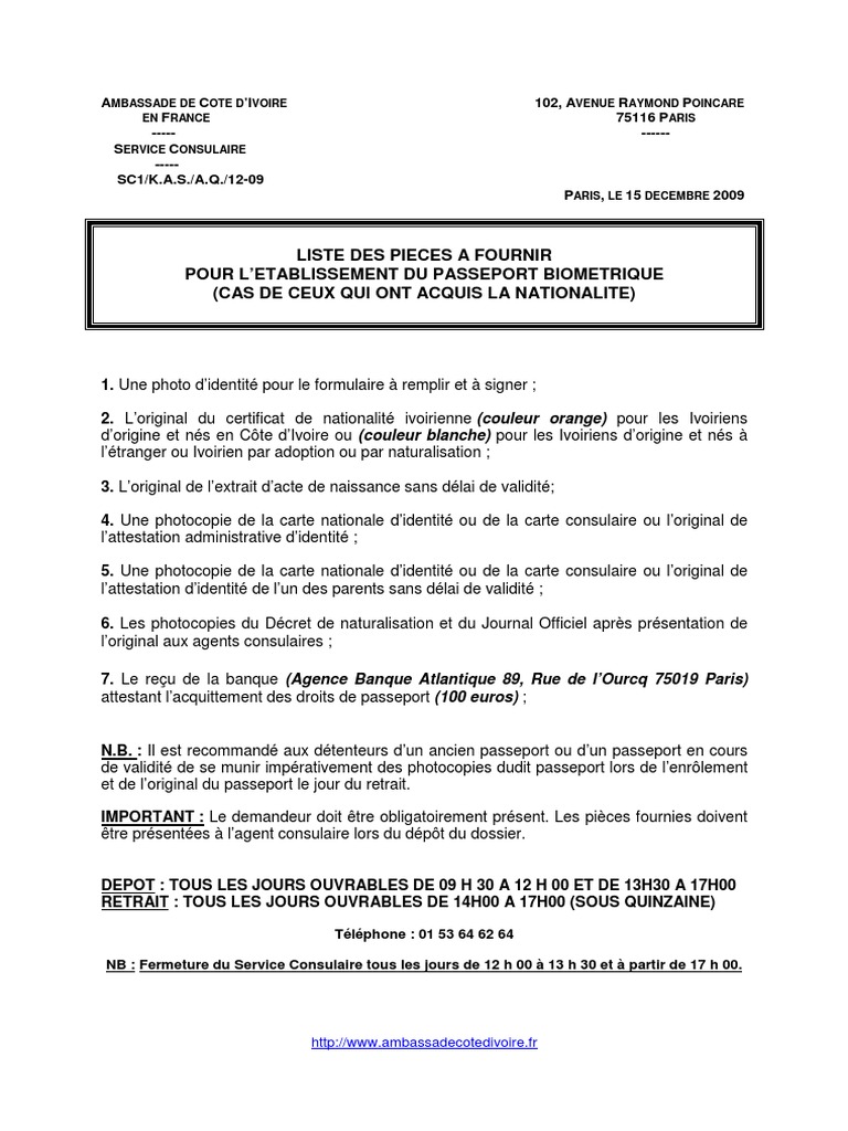 Si vous avez acquis la nationalité ivoirienne après une demande, voici ce qu’il vous faut fournir afin d’obtenir votre passeport ivoirien – Une photocopie de votre décret de naturalisation – Une photocopie de votre CNI ivoirienne ou l’original de l’attestation d’identité – Une autorisation parentale si vous êtes encore mineur. Demande de renouvellement du passeport biométrique Formulaire de demande (A imprimer et à compléter !) Photocopie de l’ancien passeport Photocopie de la carte consulaire;. Une photocopie de votre carte d’identité française ou de votre carte de séjour en cours de j’ai fait une demande pour un renouvellement de passeport le 14juin 19 nous sommes actuellement le 3 juillet et je n’ai toujours pas eu de réponse je suis censée partir en vacance le 17 juillet penser vous que je l’aurais à temps.