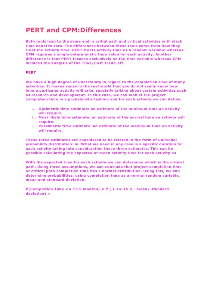 Access the answers to hundreds of Perfect competition questions that are explained in a way that's easy for you to understand. Advantages of PERT• Expected project completion time.• Probability of completion before a specified date.• The critical path activities that directly impact the completion time.• The activities that have slack time and that can lend resources to critical path activities.• Activity start and end dates. Owners often require a critical path analysis.