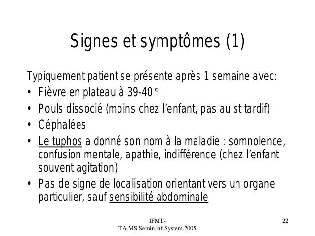 Elle est humide et. Le tableau caractéristique associe une fièvre en plateau et un pouls lent Des troubles de la conscience apparaissent, d’intensité variable, allant de la somnolence et de la prostration à une obnubilation importante le tuphos Une diarrhée classiquement "jus de melon" est présente dans la moitié des cas, associée à une sensibilité. Dans la PNEUMONIE la montée est brutale , à 40° et la fièvre reste en plateau pendant neuf jours (sans traitement, bien entendu) dans la TYPHOIDE la montée de la fièvre se fait progressivement en huit jours puis reste à 40° en plateau pendant dix jours avant de redescendre en lysis (c'est à dire par paliers) en une semaine environ.