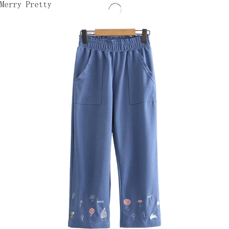 Ete Femmes Jambe Large Pantalon Dessin Anime Broderie Taille Elastique Cheville Longueur Pantalon Droit Avec Poche Femme Ample Pantalon Decontracte Aliexpress