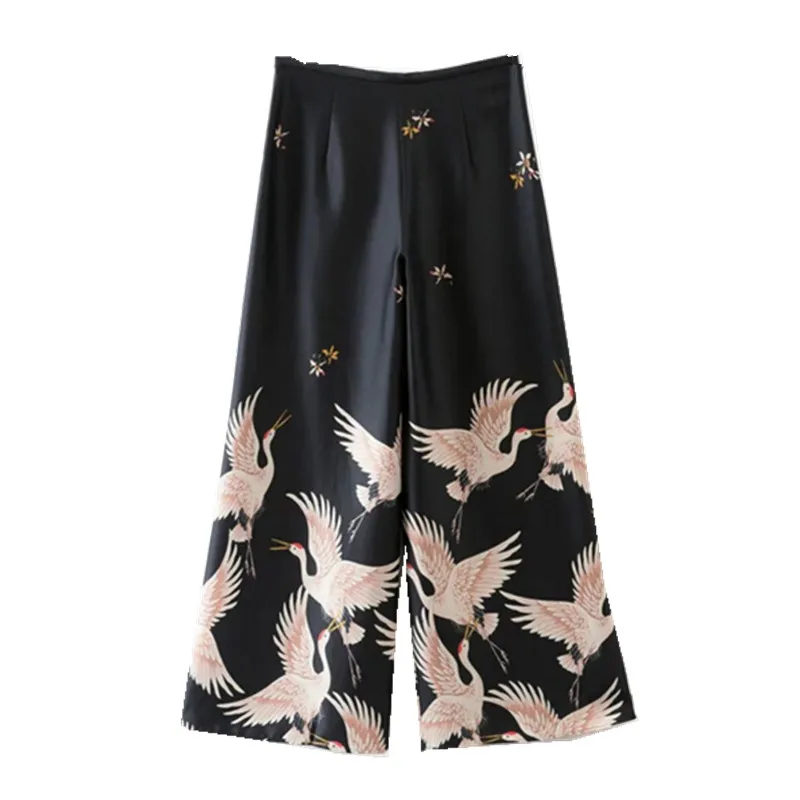 17 Ethnique Grues Imprime Noir Large Jambe Pantalon Femme Vintage Taille Haute Cheville Longueur Pantalon Femme Pantalon Decontracte Coupe Large Aliexpress