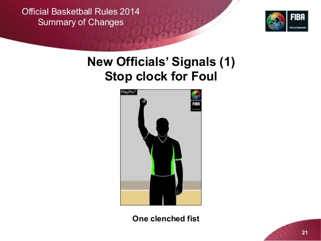 Signals are verbal and nonverbal means of communication by officials and are required by rule Each time the whistle is sounded in a basketball game, there is an accompanying signal Virtually all NFHS Basketballrelated publications contain the approved list of signals officials should use. Blocking Foul In this video, an official explains one of the basketball rules for blocking fouls Defensive players must maintain their positioning and aren't allowed to create contact by stepping into the way of a dribbler at the last second. OFFICIAL NFHS BASKETBALL SIGNALS ® 1 Stop clock 3 2 Stop clock jump ball Throwin designation 7 No score Visible counts 8 Beckoning substitutes 9 14 Goal Counts 15 4 10 16 30second timeout 11 17 Shooting/scoring 3Point attempt score Use 1 or 2 fingers after signal 15 Stop clock for foul (optional bird dog) Stop clock for foul 60second time.