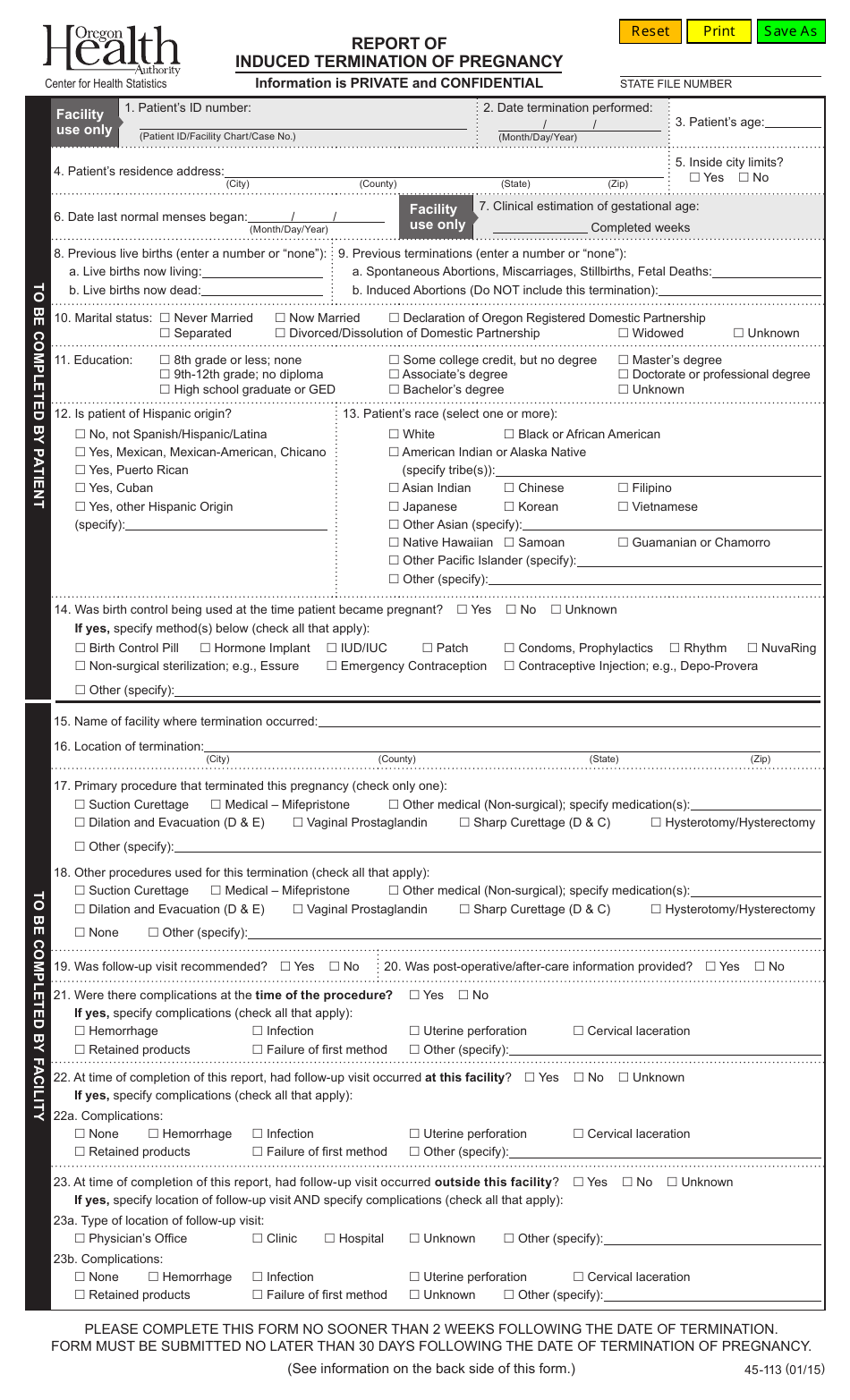 Form 45 113 Download Fillable Pdf Or Fill Online Report Of Induced Termination Of Pregnancy Oregon Templateroller