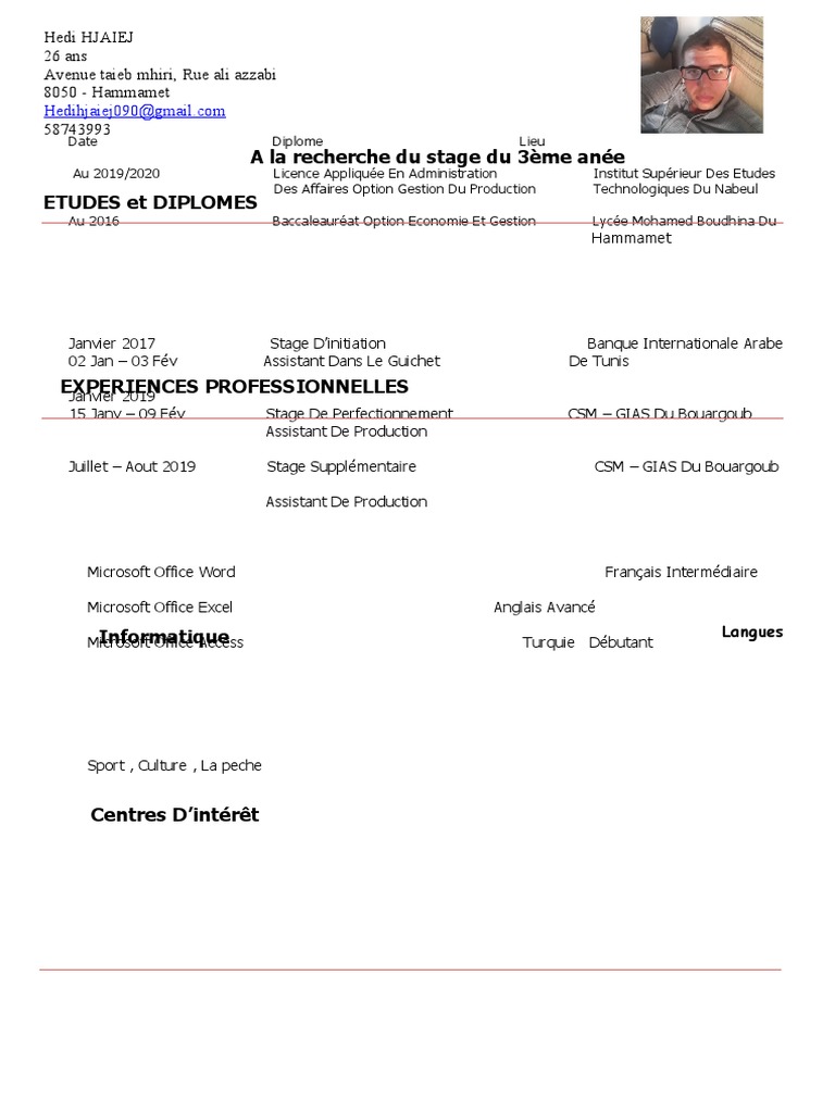 Example Resume Exemple Cv Pour Stage