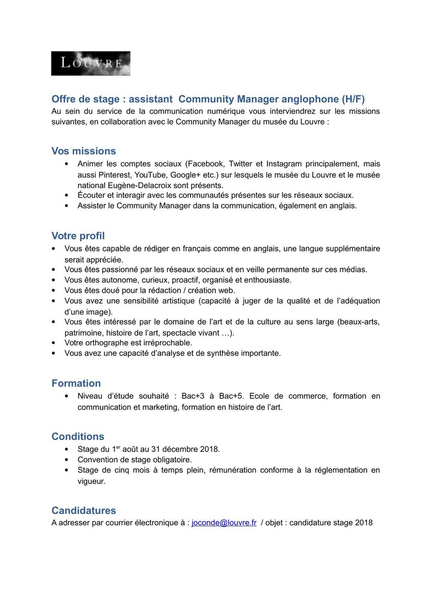 Hannah Marie Seidl Auf Twitter Museelouvre Recherche Un Assistant Cm En Stage De 8 18 Au 12 18 Tu Es Passionne E Par Les Reseaux Sociaux Doue E Pour La Redaction Creation Web Et Interesse E Par