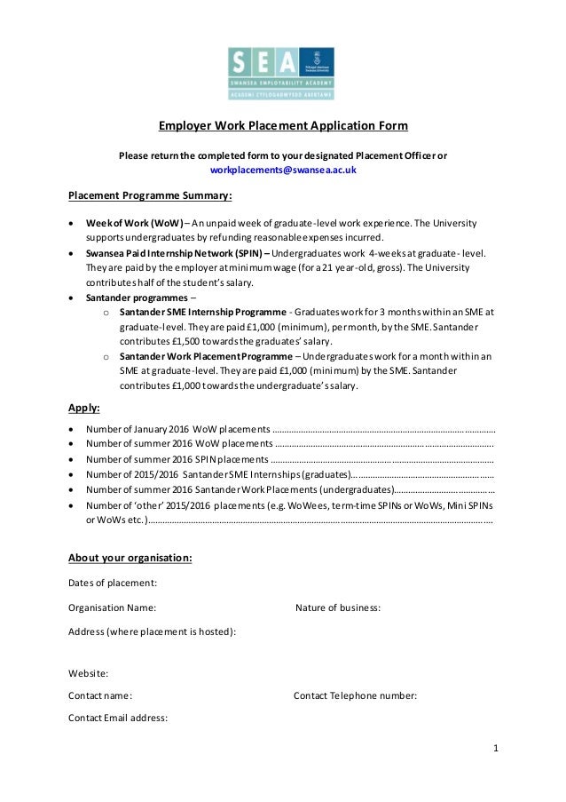 The work placement opportunity is only available to individuals who have attended applicable training sessions with Osborne Training Candidates have to start the work placement within two weeks of completion of the relevant training;. Work placements take place over a set period it can be anything from a few months to a full year In higher education, you can do a sandwich degree, where your studies will be 'sandwiched' around a work placement which is usually a year long This is ideal for matching academic learning with handson experience but It may involve extra tests. A student work placement is a scheme by which a student will undertake a normal job with an organisation for a period of six months to a year which is paid The work placement normally takes place in the penultimate year of a four year degree course, to implement and develop the skills learnt in the first two years of higher education.