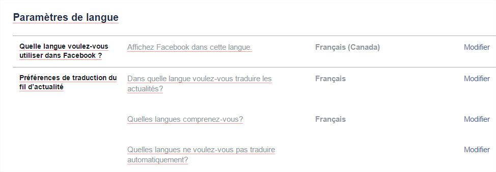 En bas de la page, cliquez sur Paramètres avancés Dans la section "Langues", cliquez sur Langue À côté de la langue que vous souhaitez utiliser, cliquez sur Plus Si la langue souhaitée ne figure pas dans la liste, ajoutezla en cliquant sur Ajouter des langues Activez ou désactivez l'option Proposer de traduire les pages dans cette. Découvrez comment voir la traduction d’une publication ou d’un commentaire Facebook écrit dans une autre langue. Découvrez où vous pouvez trouver et gérer vos paramètres linguistiques Facebook.