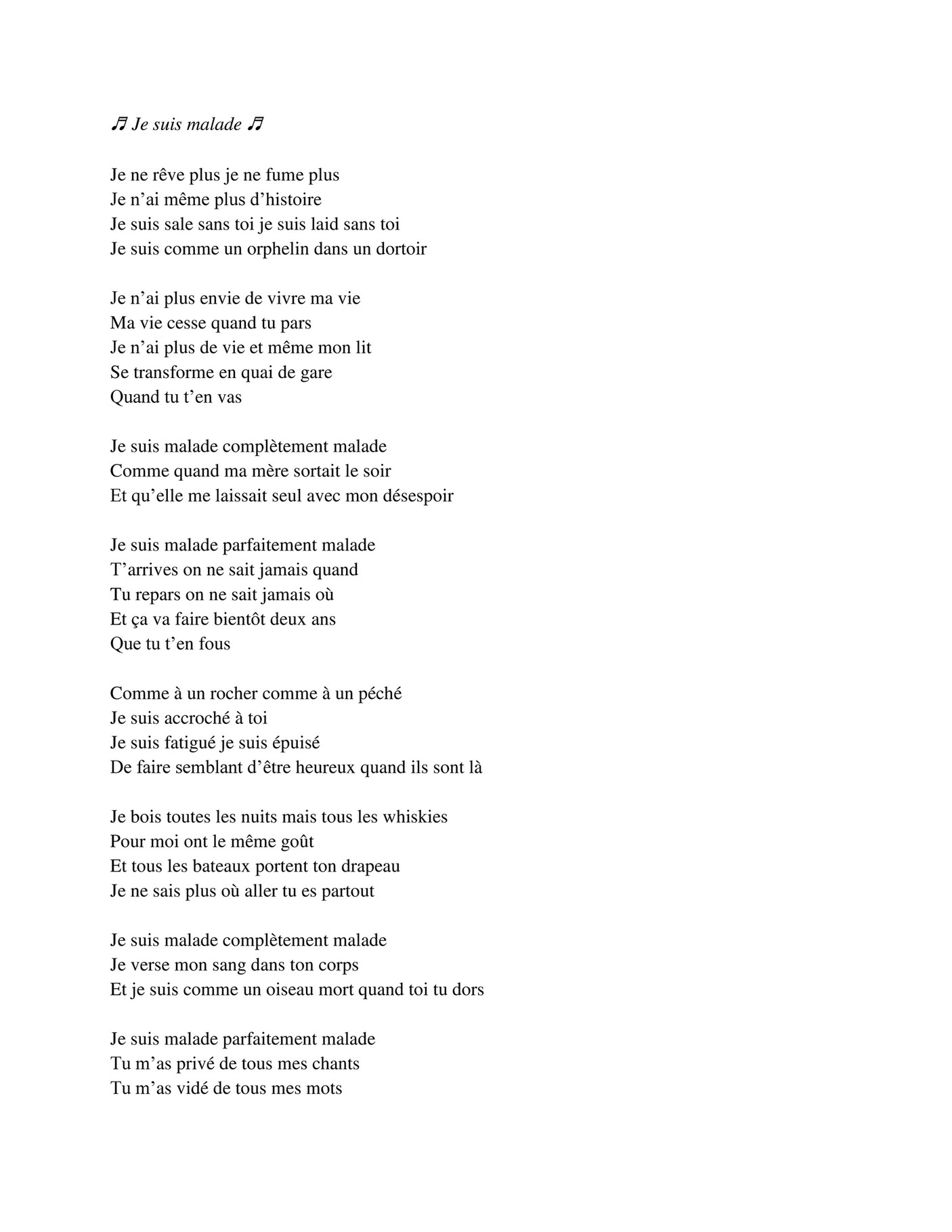 Si ça continue, je vais mourir pour vrai Moi, la femme forte, la grosse personnalité, j'vais m'en aller Ça fait longtemps que je suis morte, ça fait longtemps Qu'j'ai fermé la porte;. Je veux rentrer je suis morte de fatigue I want to go home, I'm dead tired Vous pourriez m'accueillir je n'ai pas d'argent pour un hôtel et je suis morte de fatigue You have to take me in as I have no money for a hotel and I'm dead tired Je suis morte de fatigue I'm dead tired Par contre, moi, je suis morte de fatigue. Je suis fatiguée et au bord de la rupture Deux décès dû au coronavirus en HauteGaronne sont officiellement confirmés par l'Agence Régional de Santé (ARS) de santé En revanche, L'ARS.