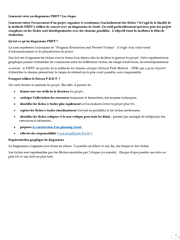 On utilise souvent le réseau PERT en complément du diagramme de GANTT En effet, cette technique est plus précise et permet ainsi de mieux ordonnancer les tâches du projet La force du réseau PERT, c’est qu’il permet de mieux identifier les dépendances qui existent entre les différentes tâches du projet. Télécharger Diagramme de pert en ligne free gratuit organiser et gérer le flux de travail au sein de l'équipe onlyoffice workspace fournit les éditeurs des documents en ligne les outils de la gestion des projets et de la relation client le calendrier et la communauté le serveur de messagerie l'agrégateur de mail le chat. Le diagramme de PERT Le diagramme de PERT matériel nécessaire *** logiciel spécifique MS PROJECT MÉTHODE Guide méthodologique du travail en commun PLANIFIER LE PROJET ORGANISER LE PROJET Objectif Le PERT (Program of Evaluation and Review Technique) est " une méthode consistant à mettre en ordre sous forme de réseau plusieurs tâches qui, grâce à leur dépendance et à leur.