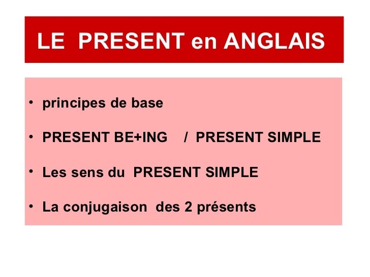 Continuons la leçon sur le présent en anglais!. Modèles de conjugaison anglaise et verbes irréguliers Cherchez la traduction du verbe present en contexte et sa définition Verbes anglais similaires disallow, overlook, exploit Modèle obey Auxiliaire have, be Autres formes present oneself / not present Conjuguer aussi read, identify, mean, delete, visualize, navigate, order, swear, capture, license. Le présent simple anglais n’est pas lié à un moment précis du présent comme en français Grâce à nos explications simples et claires accompagnées de nombreux exemples, tu apprendras tout ce qu’il faut savoir sur l’emploi et la règle de formation du présent simple en anglais et tu pourras tester tes nouvelles connaissances avec.
