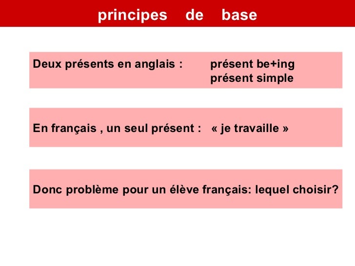 L’usage des temps en anglais Quand il s’agit de verbes, les temps en anglais sont régis par le présent, le présent continu, le passé simple, le past continuous et le futur Le présent En anglais, on distingue deux temps au présent le présent simple et le présent continu Le présent simple ou ‘simple present’. Cours d'anglais débutant Les valeurs du présent Le système des temps est plus simple en anglais, c’est pour cette raison qu’il faut bien maitriser les notions des temps et celle de leurs valeurs pour pouvoir mieux comprendre le reste du cours ainsi que l’utilisation de chaque notion Si le temps grammatical en anglais indique dans quelle période se situe l’action exprimée par le. Formes composées Français Anglais à présent que loc conj locution conjonction groupe de mots qui servent de conjonction Ex "parce que", "depuis que" (maintenant que) now that conj conjunction Connects words, clauses, and sentencesfor example, "and," "but," "because," "in order that" À présent qu'ils sont mariés, il peut faire une demande de carte de séjour.