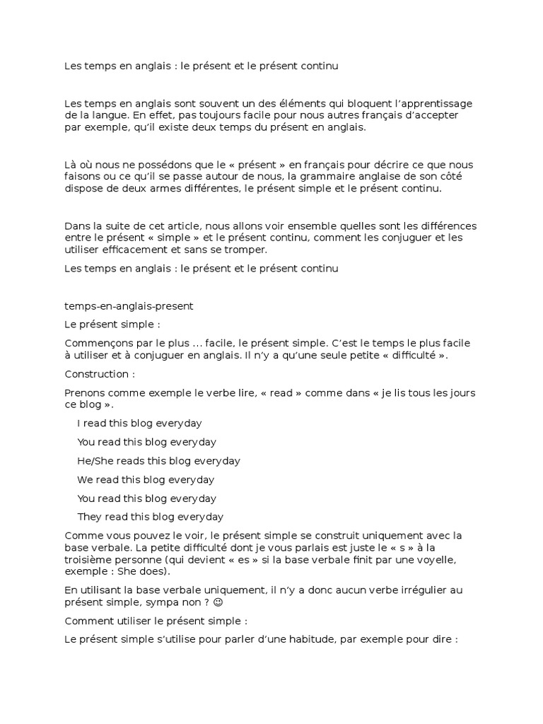 Capsule pour expliquer la formation du présent simple. Exercice temps anglais le present simple Voici trois exercices sur les temps en anglais pour vous entraîner sur le present simple formes des verbes, questions et négation Cliquezici pour télécharger cette page d’exercice au format PDF à imprimer !. Lors de vos premières leçons d’anglais, vous devez légitimement douter de l’utilisation des différents temps grammaticaux du présent Quand la situation que vous évoquez est toujours en cours, c’est bien le Présent Be Ing qui doit être employé En revanche, lorsqu’il s’agit d’une habitude, recourez au présent simple.