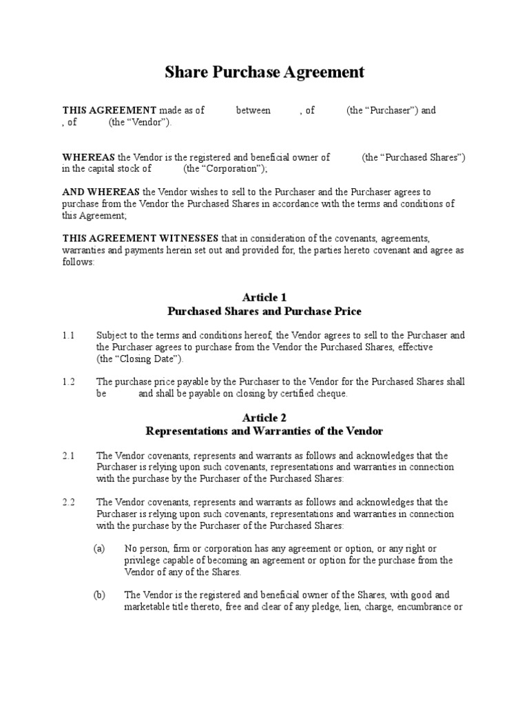 35 If more than one Offeree has given a Buying Notice to the Seller indicating his/her willingness to purchase the Offered Shares, then, the Buyers shall purchase all the Shares comprising the Offered Shares in such proportions as they may agree upon, or, in the absence of agreement, in the Common Share Ratios of each Buyer, computed without. A purchase agreement template is a legitimate document that is used to outline terms and conditions relevant to the transaction This document includes all the terms and conditions that they buyer and seller agree to perform You can create your own purchase agreement straightly from our given format and after creating, you can take print at once It is a binding contract between parties for purchasing fixed or current assets. A Share Purchase Agreement should be used any time an individual or corporation is selling or purchasing shares in a company to or from another person or business entity For example, if you and two business partners all have equal shares in a company and one partner wishes to withdraw, a Share Purchase Agreement can be used to purchase the.